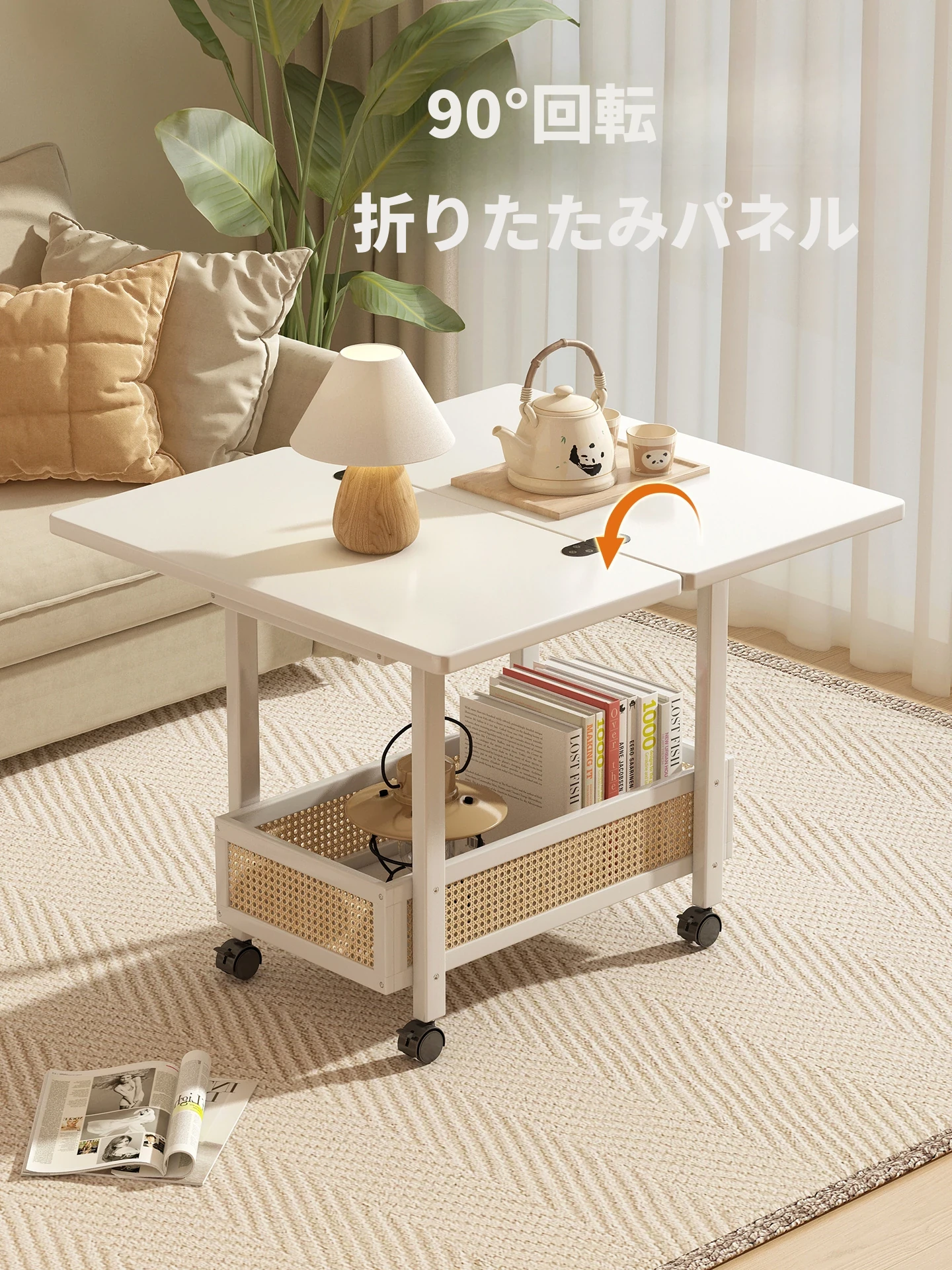 コンパクトでおしゃれなリビングにぴったり!クリーム風の折りたたみサイドテーブル、家族や友人とのくつろぎの時間を演出するための便利なキャスター付き収納ラック。小さなお部屋にも最適です!