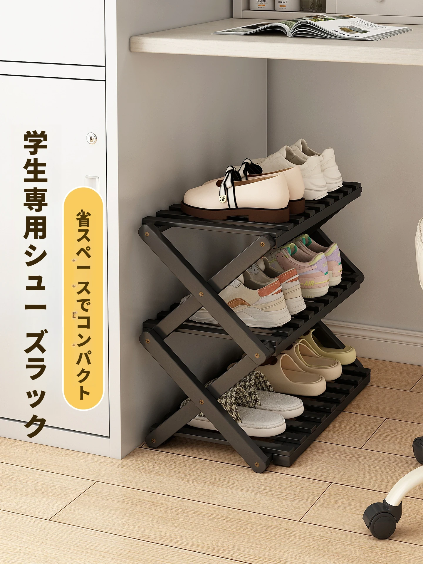 折りたたみ靴ラック 小型オフィスや寮に最適!設置不要の省スペースデザインで、玄関やデスク下にピッタリ。多層収納で靴を整理整頓。おしゃれで便利な靴の収納アイテム!