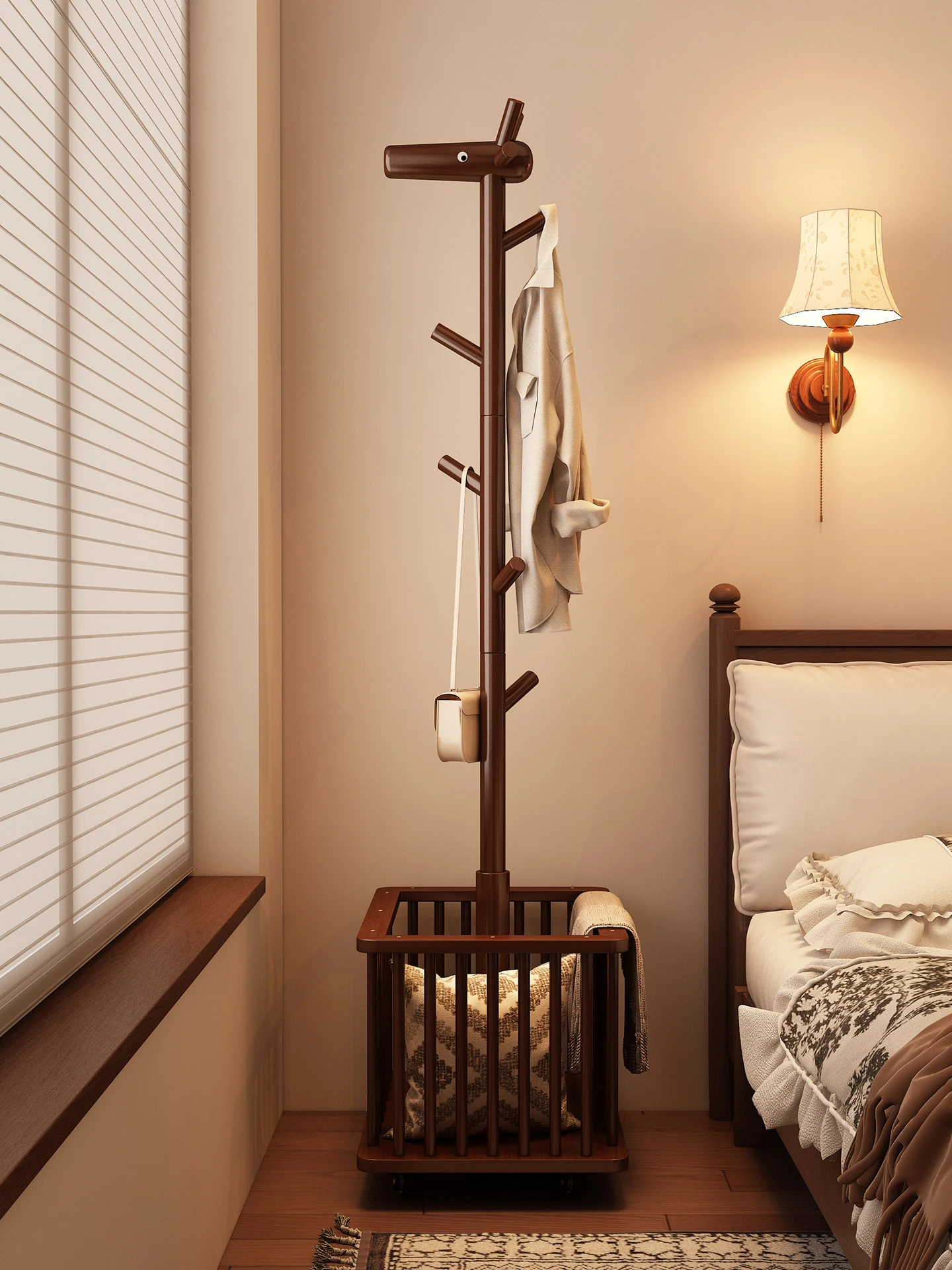 天然木製の小鹿型ハンガーラック - お部屋を彩る可愛いデザイン!リビングや寝室にぴったりの移動可能な衣類収納アイテム。お子様の帽子やコートもスッキリ整理できる、創造的なデザインの洗濯かご付き!